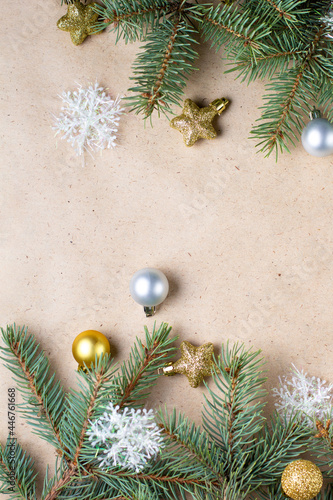 border of fir tree branch with gold decoration on craft paper for christmas card with copy space for text.