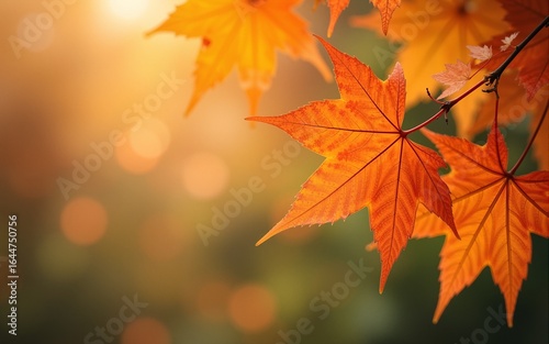 border of orange maple leaves on a branch with bokeh in the background, autumn vibes. High quality