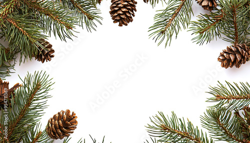 border of pine branches and pine cones arranged on a white background, leaving a blank space in the center