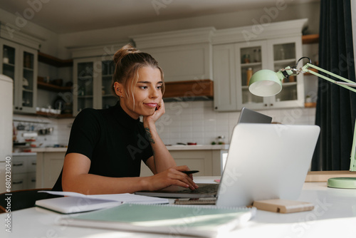 Bored young woman sitting at the desk and looking at laptop while studying at home