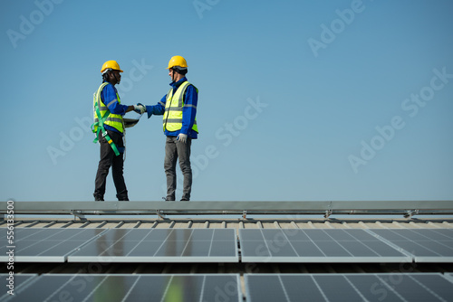 Both of Engineer in charge of solar panel installation The installation of solar energy conversion into electricity for a warehouse is currently being investigated.
