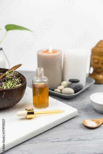 Bottle natural organic oil essence serum with healing herbs and sea salt. Aromatherapy and beauty. Concept set of harmony, balance and meditation, spa, massage, relax, beauty spa treatment.