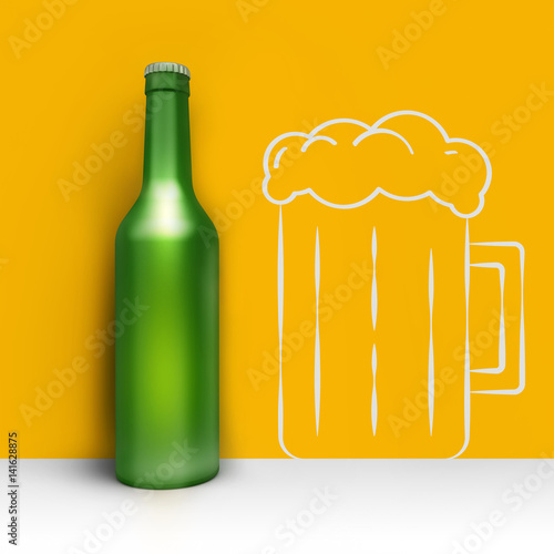 Bottle of beer in corner on wall with hand drawn painted glass. Creative illustration. Front view. 3D render.