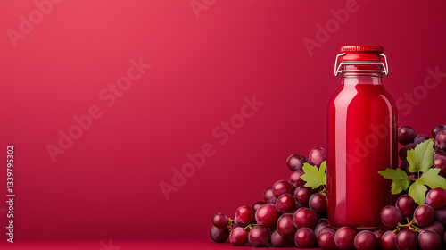 bottle of grape juice surrounded by fresh red grapes and green leaves on a bold red background
