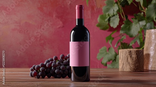 Bottle of red wine with blank pink label standing on wooden table next to bunch of grapes with vine leaves and wooden blocks on red background
