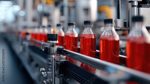 Bottled Beverage Production Line with Red Liquid in a Modern Factory Setting Showcasing Automated Machinery and Efficient Workflow