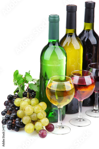 bottles and glasses of wine and assortment of grapes, isolated