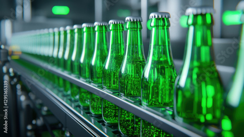 Bottles moving through beverage filling machine, showcasing vibrant green color and modern industrial setting. scene captures efficiency of production process
