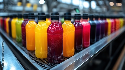 Bottles of colorful juice on a conveyor belt, industrial setting