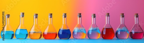 Bottles of different colored liquids lined up on a table, Chemical physical experiments, Banner, Copy space