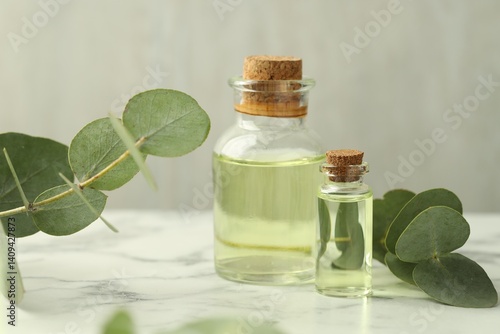Bottles of essential oil and eucalyptus leaves on white marble table, closeup