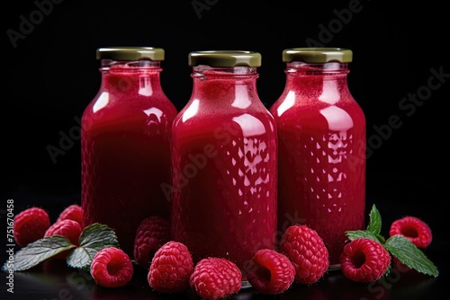Bottles of fresh raspberry juice and berries lie on a black background isolated