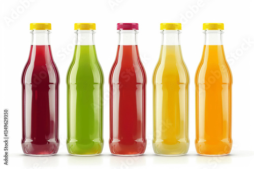 Bottles of juice in various colors, concept: drinks, beverages, juice, refreshment, colorful, isolated, healthy, variety,