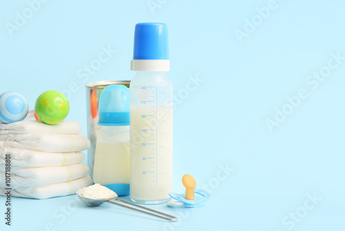 Bottles with baby milk formula, diapers, rattle and pacifier on color background