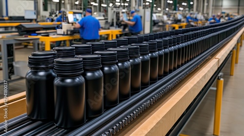 Bottling process takes place in a modern manufacturing facility with workers assembling products on an efficient production line