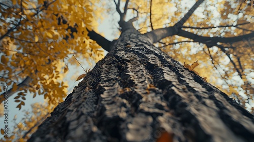 Bottom view of tree trunk to yellow leaves of big tree in the forest. Fresh environment in park. Plant give oxygen in the garden. Forest tree with yellow and green leaves. Black tree bark texture