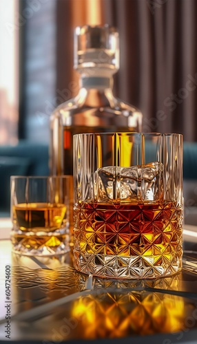 Bourbon in a Glass with Bottle on Table. Generative ai