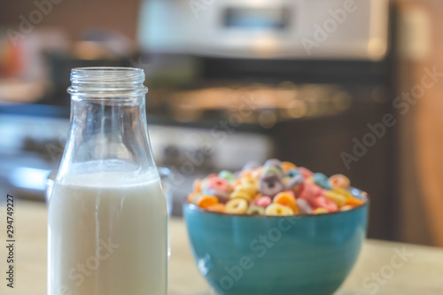 Bowl of colorful children's cereal and milk isolated on wood table with Text space
