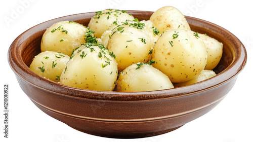 bowl of cooked. small potatoes garnished with herbs. showcasing a simple yet appealing presentation ideal for a side dish the earthy tones of the bowl complement the light color of the potatoes. makin