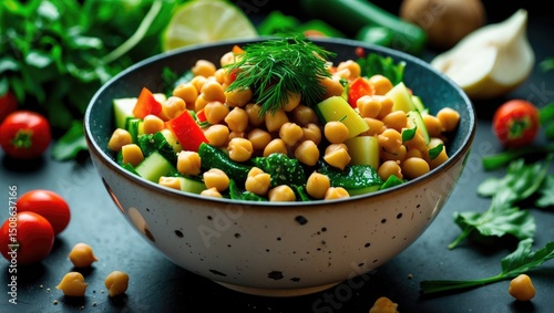 Bowl of Fresh Vegetables and Chickpeas Salad as a Healthy Eating Concept with Blank Space for Text