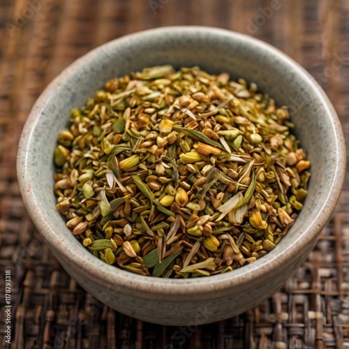 Bowl of mixed aromatic spices on woven surface.