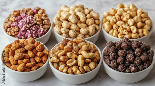 Bowl of mixed nuts with a variety of textures isolated on a white background showcasing healthy snacks