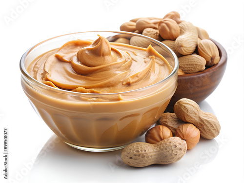 Bowl of peanut butter and peanuts isolated on white background. clipping path