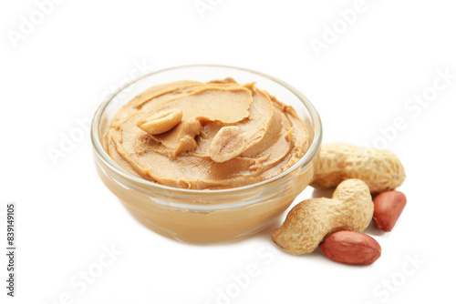 Bowl of peanut butter and peanuts isolated on white background. Creamy peanut pasta in small bowl.