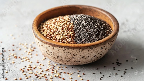 Bowl of quinoa and chia seeds on a clean white surface, representing healthy grain alternatives
