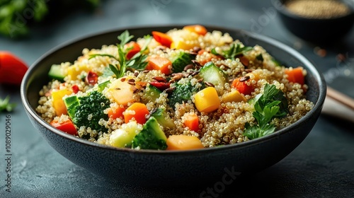 Bowl of quinoa salad with mixed vegetables and a sprinkle of seeds, nutrient-dense brain food, wholesome meal