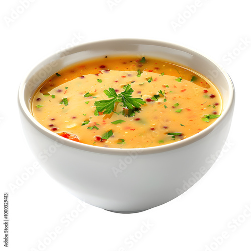 Bowl of rich soup topped with fragrant herbs, making a colorful and inviting display against a see-through backdrop