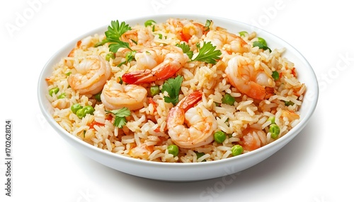 Bowl of Shrimp Fried Rice with Peas and Parsley Isolated on White Background