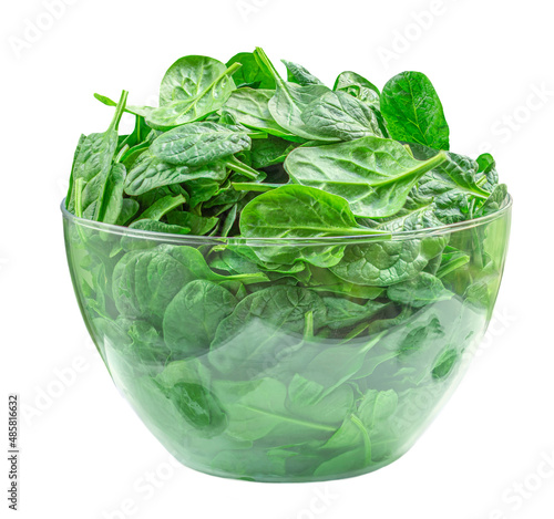 Bowl of Spinach leaves isolated on white background. Fresh Spinach Closeup.