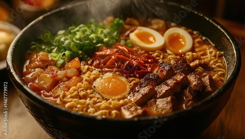 Bowl of steaming ramen with eggs, meat, and vegetables