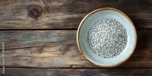 Bowl of white poppy seeds on rustic wooden surface, top view, soft light highlights grain textures, earthy color tones, round ceramic dish.