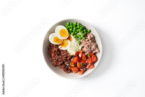 Bowl with rice, tuna, green peas and chopped tomatoes