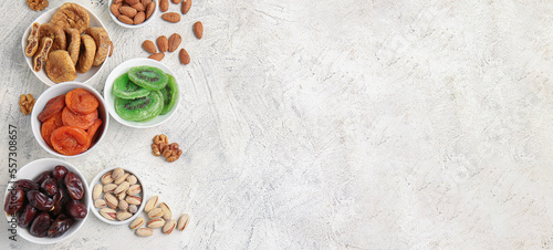 Bowls with different dried fruits and nuts on light background with space for text