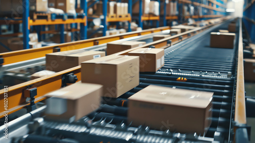 Boxes moving along a conveyor belt in a busy warehouse during daytime operations