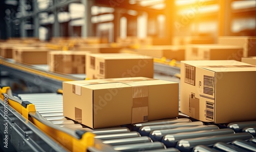 Boxes on a Conveyor Belt in a Busy Warehouse