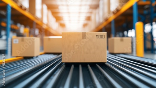 Boxes on Conveyor Belt in Warehouse with Blurred Background