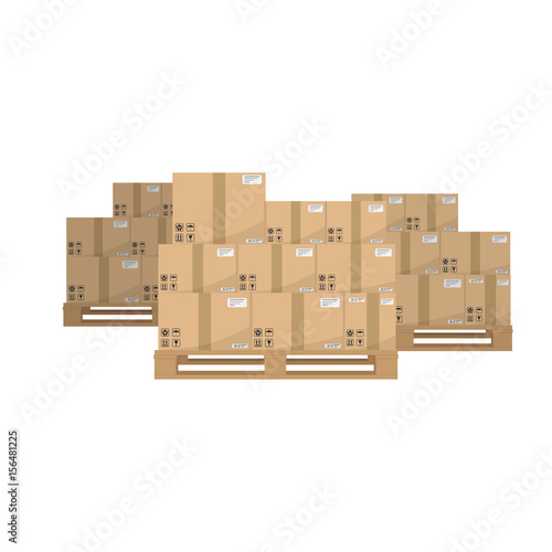 Boxes on wooded pallet. Brown closed carton delivery packaging boxes with fragile signs on wooden pallet