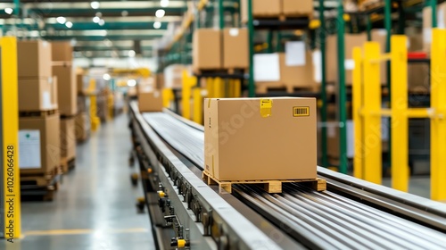 Boxes traveling down a conveyor in an organized warehouse, showing the streamlined process of modern distribution, copy space, vibrant, Fusion, factory backdrop.