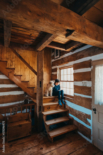 Boy and dog sitting on stairs of log cabin home looking out window.