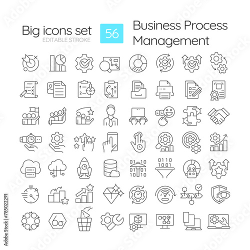 BPM organization linear icons set. Workflow managing, administration resources. Management software. Customizable thin line symbols. Isolated vector outline illustrations. Editable stroke