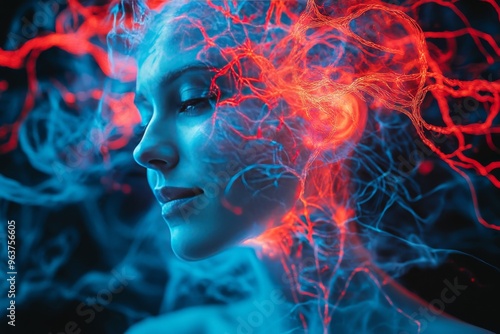 Brain signaling Cranial nerve Woman’s head illuminated with glowing red and blue neural patterns symbolizing intellect creativity and the fusion of mind and technology in a futuristic world