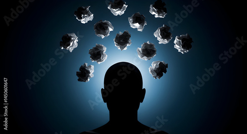Brainstorming concept silhouette of a person with crumpled paper creativity and mental block illustration