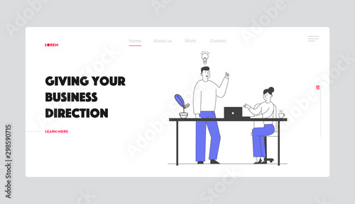 Brainstorming Group Solving Problems, Planing Project Website Landing Page. Businessman with Light Bulb Telling Creative Idea to Woman Web Page Banner. Cartoon Flat Vector Illustration, Line Art