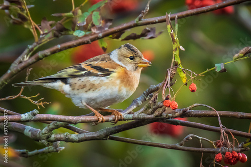Brambling bird, Fringilla montifringilla, in winter plumage feeding berries