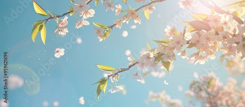 Branch of a cherry blossom tree in a sunny garden with a clear blue sky in the background Gentle natural scenery. Copy space image. Place for adding text and design