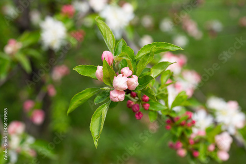 branch of apple tree with pink flowers on a background of flowering trees spring time
